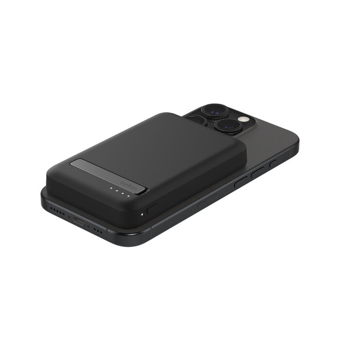 Wirelessly charge iPhone and other Qi2-enabled smartphones quickly and safely with our BoostCharge Pro Magnetic Power Bank with Qi2 15W 5K§. Your Qi2 and MagSafe compatible devices will have easy and seamless on-the-go charging up to 15W. Watch video, stream or create content at the perfect viewing angle with the integrated kickstand — even while your device is charging.