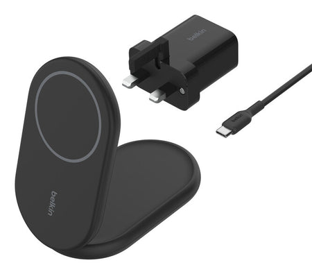 Our versatile Qi2 wireless charger is engineered with a durable hinge to be used as a stand or lay flat as a pad. Charge as you like, view your iPhone in stand mode, and fold up for compact storage.