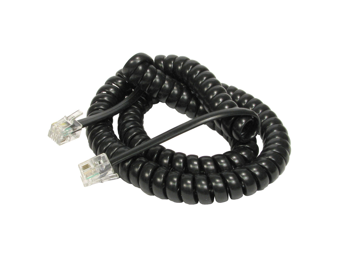 The coiled handset cable uses an RJ10 4P4C connector for use with telephone handsets.