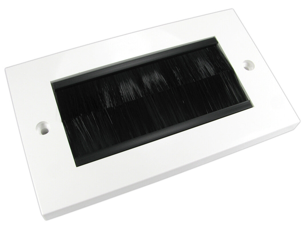 The UT-734BK is a white cable entry/exit faceplate with a black brush to keep the plate tidy where the cables exit the wall or trunking. It is designed to attach to a standard dual gang back box.