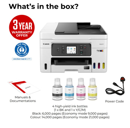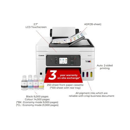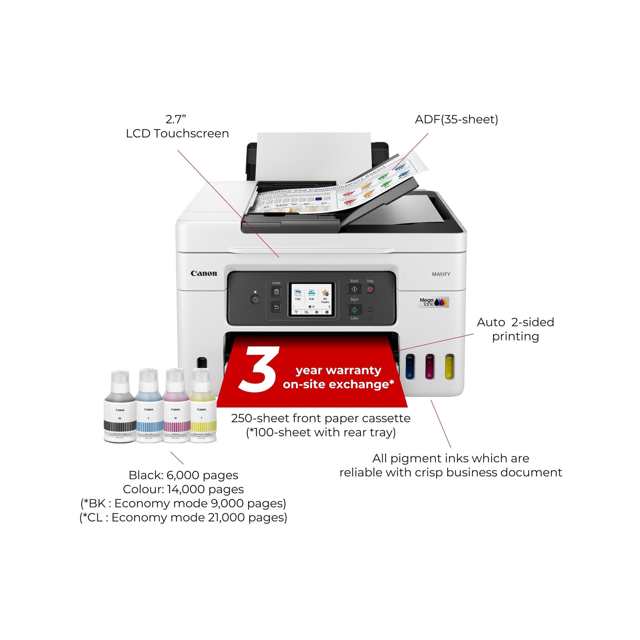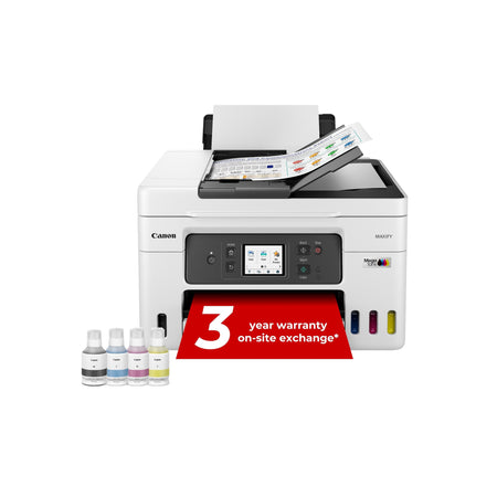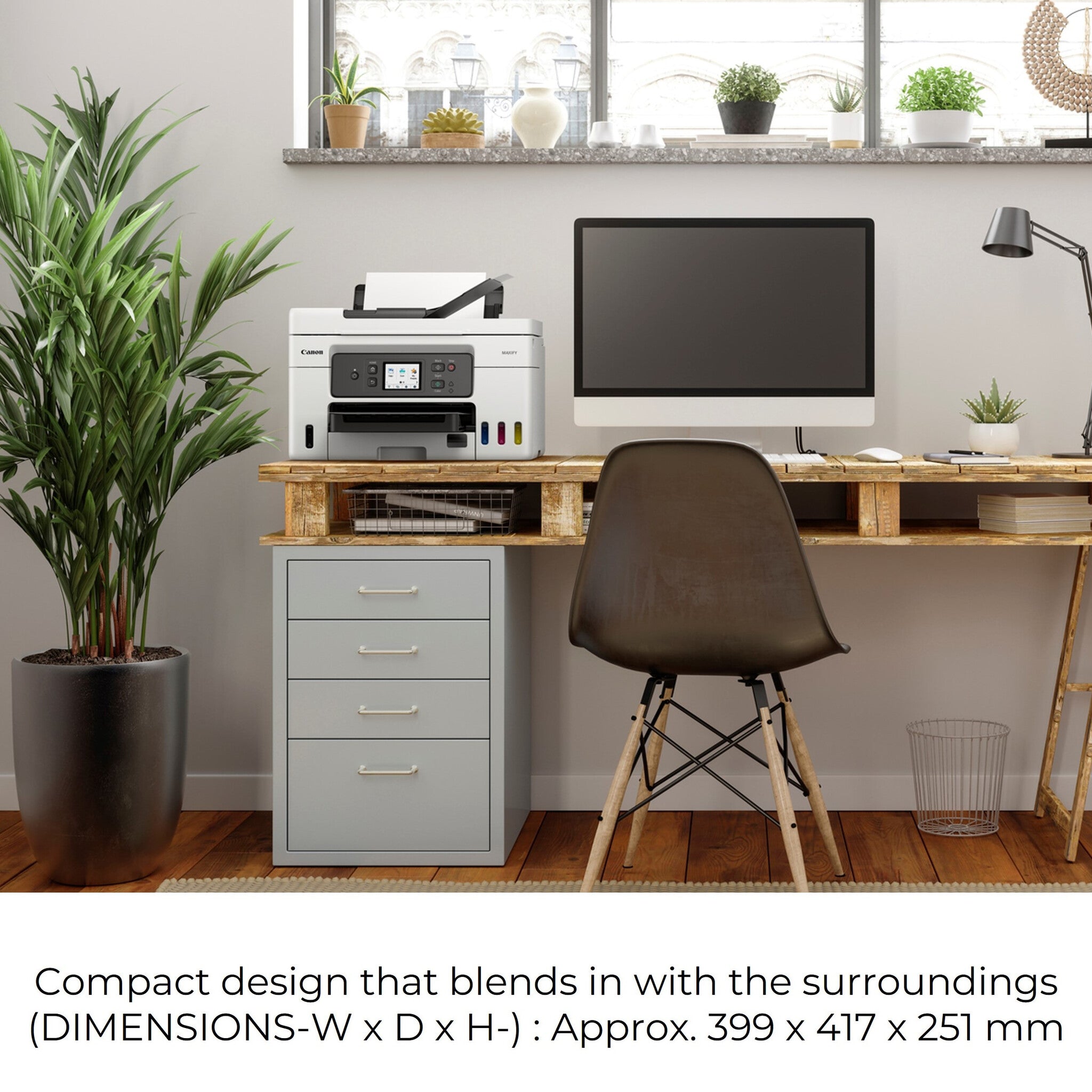 Print large volumes of high-quality business documents while making huge savings on CPP and TCO with this refillable and easy to use 4-in-1 MegaTank-equipped MAXIFY GX printer with ADF, Wi-Fi and Ethernet.