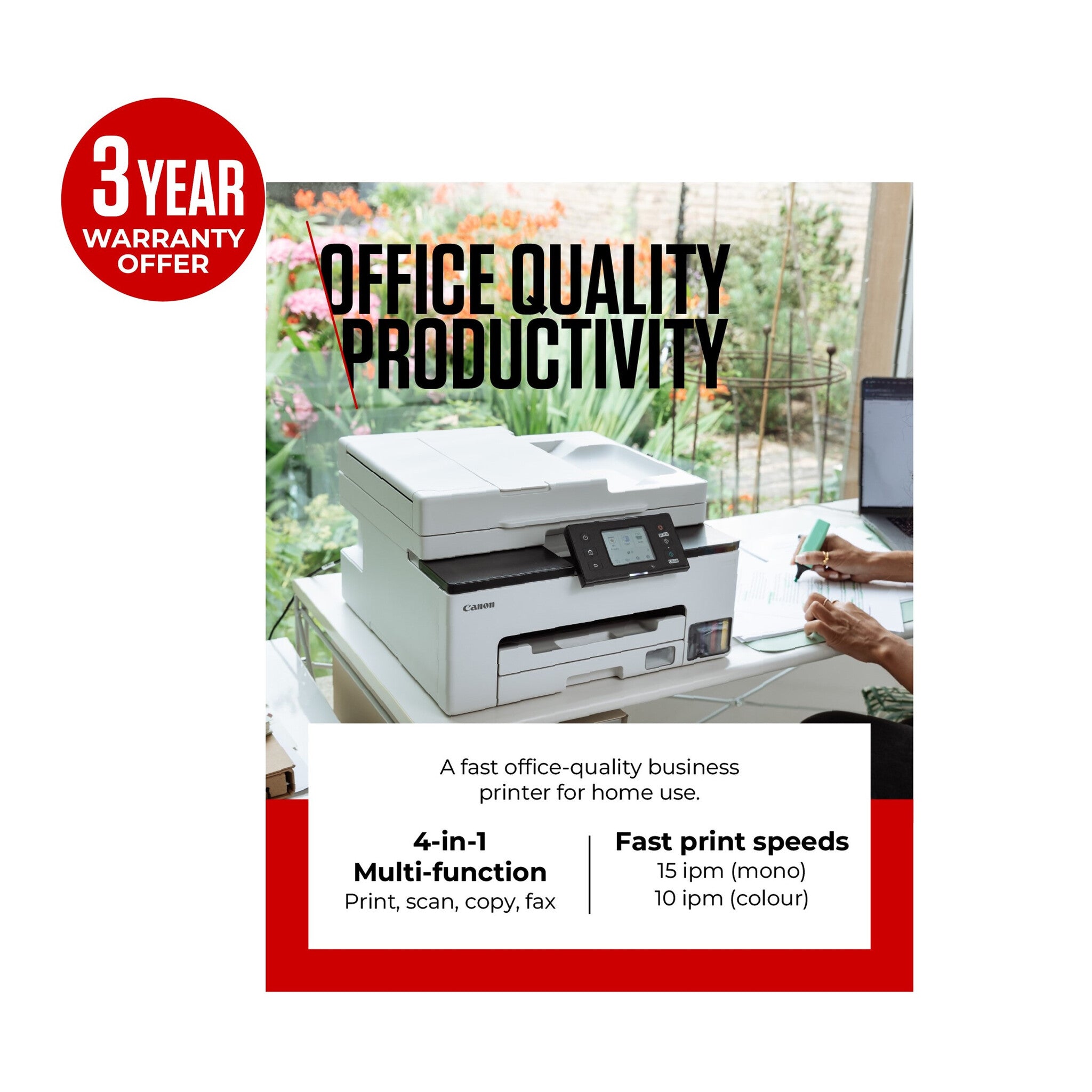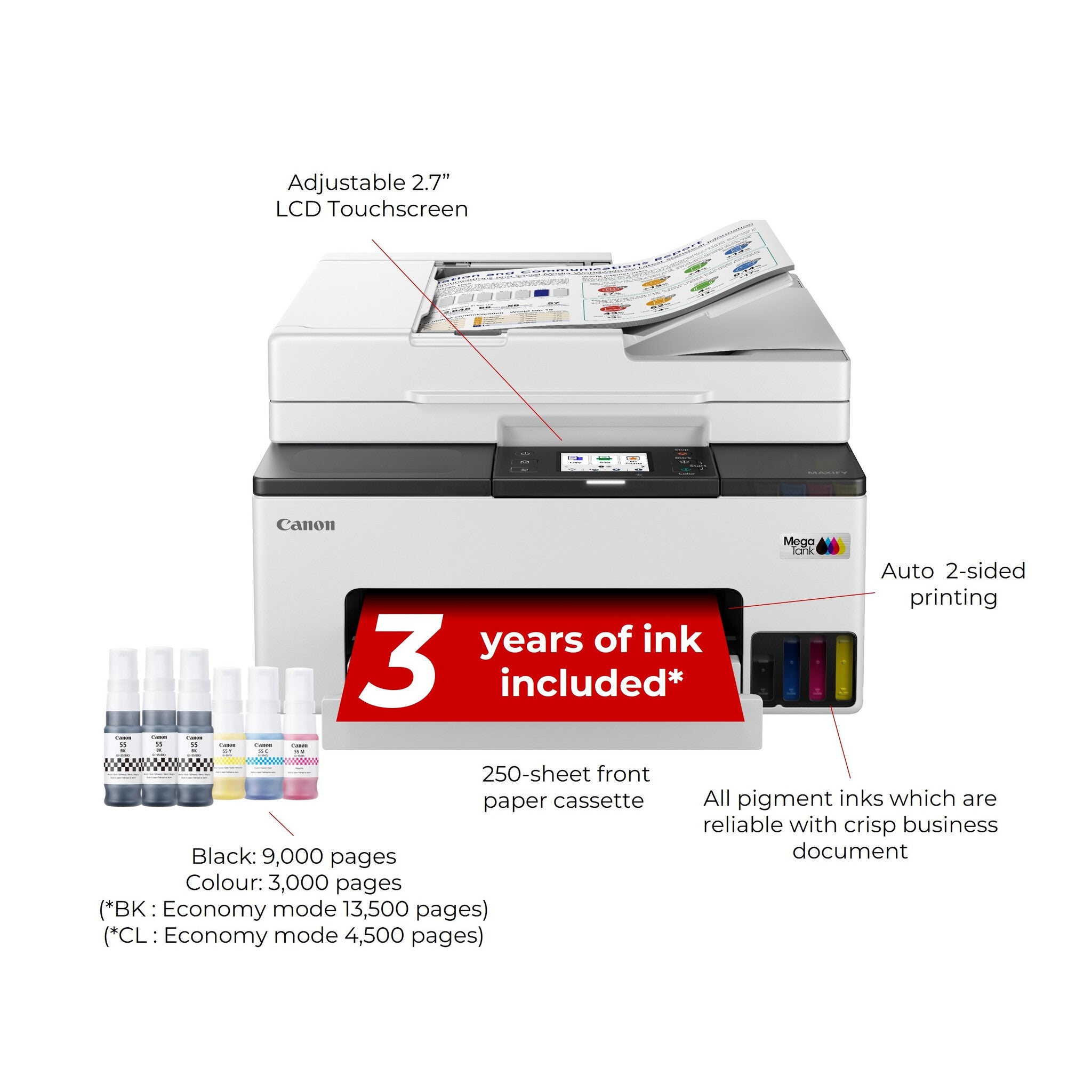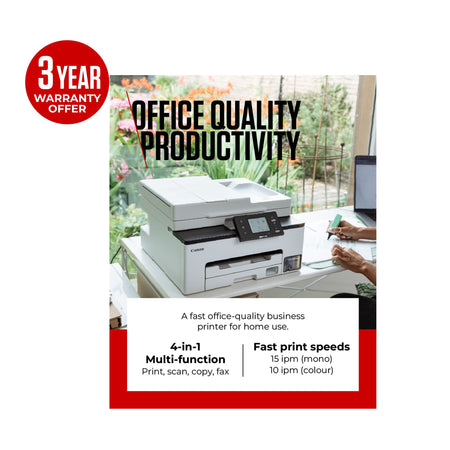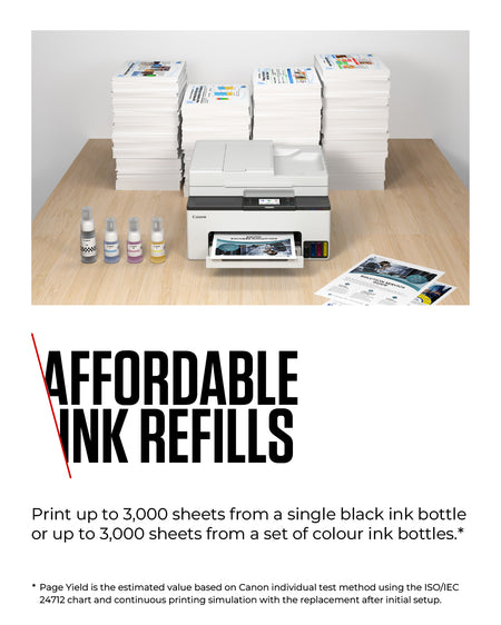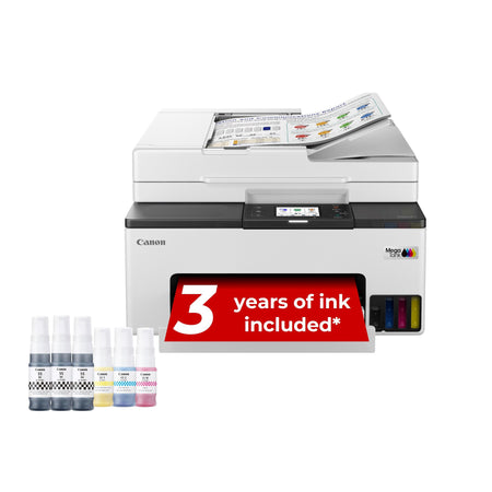Produce durable business-quality documents at home with this full front operation multifunction MegaTank printer. MAXIFY GX2050 fits in any space due to its compact and user-friendly design. Benefit from fast print speeds and high yields with affordable ink bottle replacements, plus a 35-sheet ADF for scanning, copying and faxing multi-page documents.