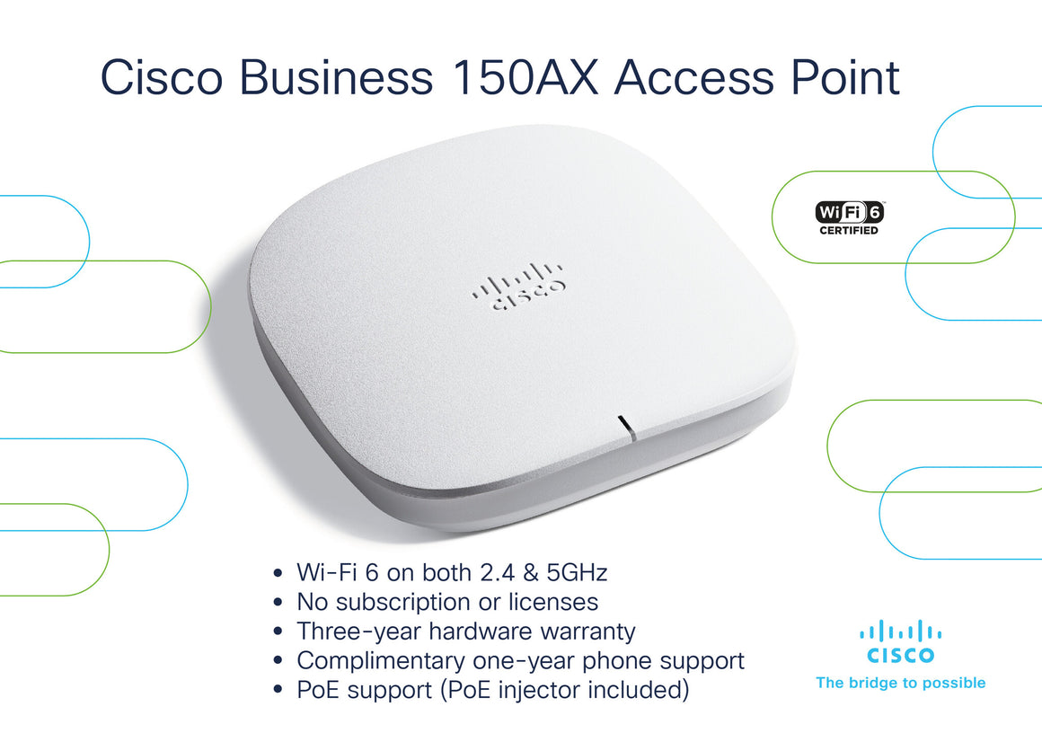 The Cisco Business 150AX Access Point delivers increased speed and capacity with Wi-Fi 6 in a compact form factor. Ideal for indoor Wi-Fi coverage, the Cisco Business 150AX delivers a highly secure and reliable wireless connection for small business workplaces. Compatible with Cisco Business 151AXM Mesh Extenders to rapidly expand your Wi-Fi network.
