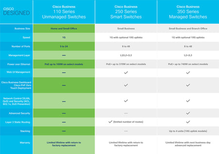 The Cisco Business 110 Series Unmanaged Switches are affordable, plug-and-play entry-level switches that provide gigabit Ethernet switching with key features like Power over Ethernet (PoE), energy efficiency, and traffic prioritization for a fast and resilient small business network.