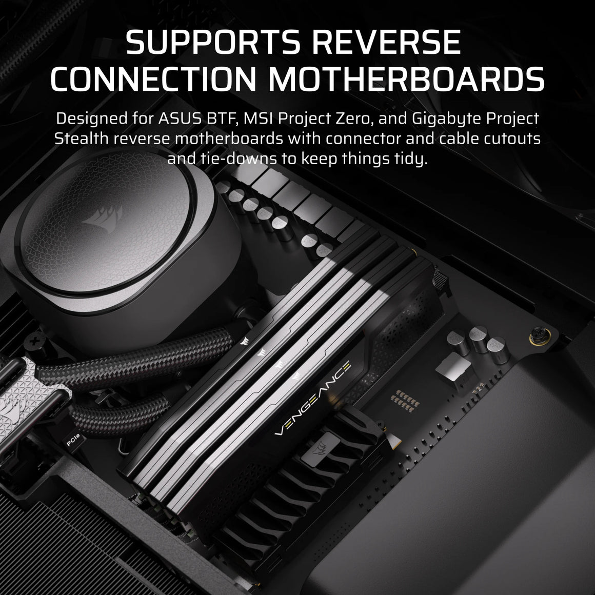 Fully compatible with reverse-connector motherboards from Asus, MSI, and Gigabyte, allowing for unobstructed airflow and a super-clean build.
