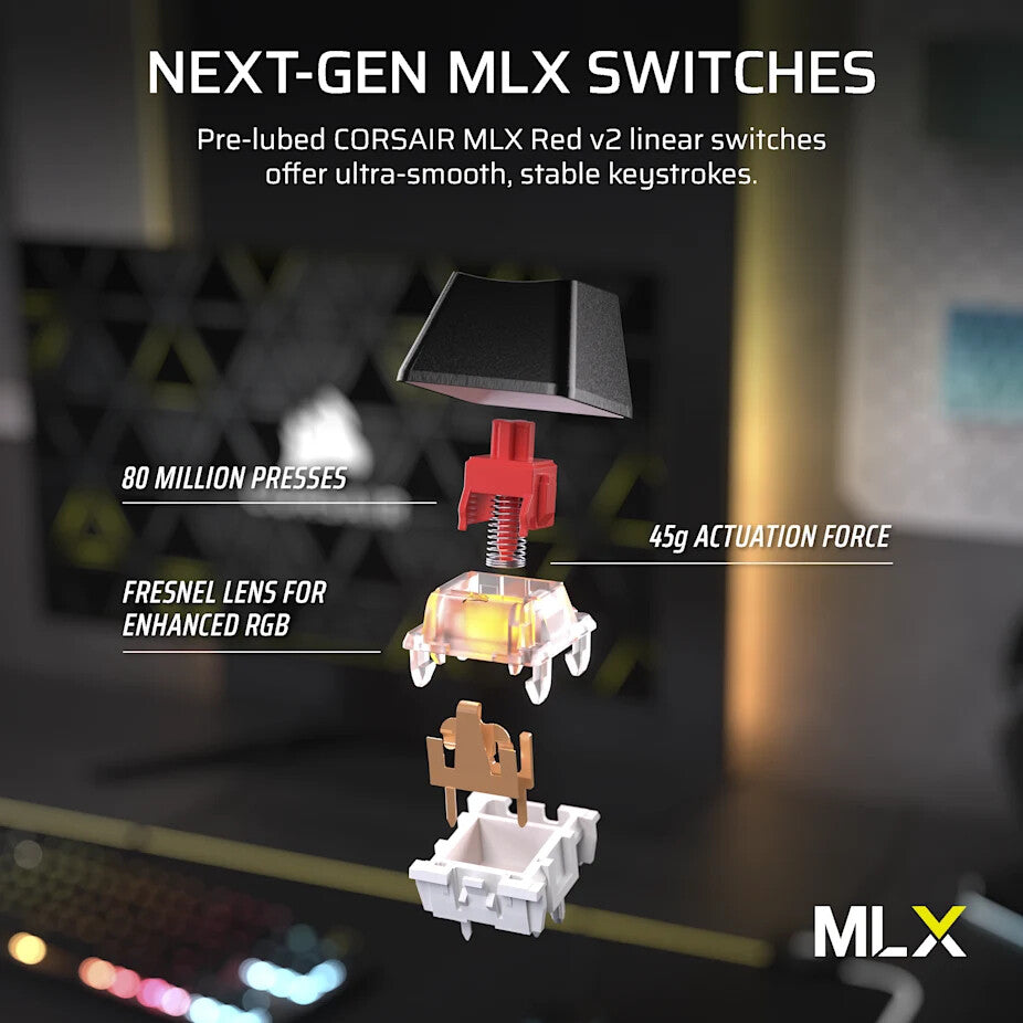 CORSAIR MLX Red v2 linear switches are pre-lubed, so you can enjoy buttery smooth keystrokes.