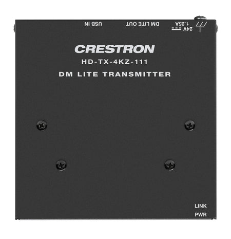 Compact in design, the HD‑TX‑4KZ‑111 can be mounted onto a flat surface such as the underside of a table, behind a credenza, or inside a podium. It can also be attached to a single rack rail in the back of an equipment cabinet. The HD‑TX‑4KZ‑111 can receive power from the included power pack or from the remote DM Lite receiver or DMPS Lite switcher.