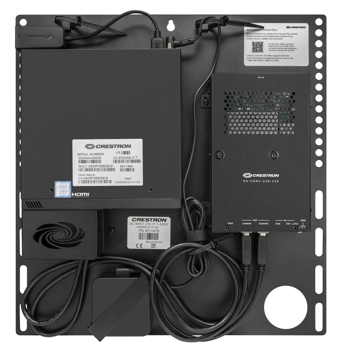 The UC Bracket Assembly provides preassembled components on one ready-to-mount bracket to simplify installation. The assembly can be mounted on a wall, or it can be attached to the rear of the display device. Crestron's direct connection method further simplifies installation with a single connection from the Flex tabletop conference device to the UC Bracket Assembly.