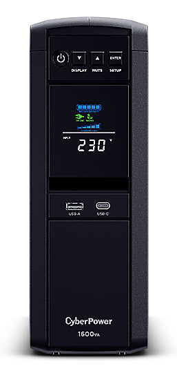 CyberPower CP1600EPFCLCD with Pure Sine Wave output safeguards mid- to high-end computer systems, servers and networking hardware that use conventional and Active Power Factor Correction (PFC) power supplies. Designed with GreenPower UPS™ Technology to improve UPS operating efficiency and to minimize its energy consumption, this UPS delivers significant energy cost savings over conventional UPS systems.