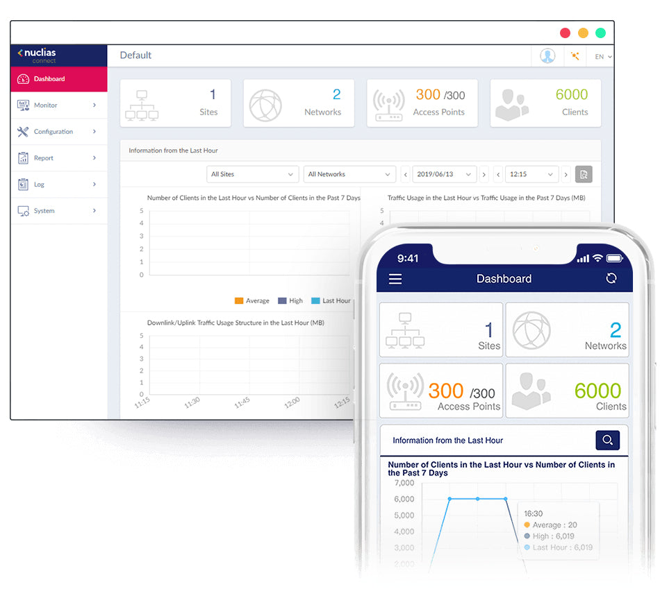 Nuclias Connect enables you to manage and control your network from anywhere and provides an extensive understanding of your network and its users through traffic analytics and status reports via a web browser or our free app. Insights derived from this traffic data can be used to create business value, and traffic can be viewed across the entire network and all the way down to the level of a single Access Point.