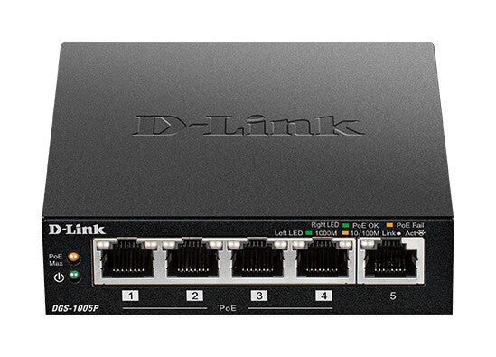 The D‑Link DGS‑1005P 5‑Port Desktop Gigabit PoE+ Switch enables you to connect Power over Ethernet (PoE) devices such as wireless access points (APs), network video cameras and IP phones to the network. Built with home and small business users in mind, the DGS‑1005P is compact and operates silently, making it ideal for most rooms and offices.