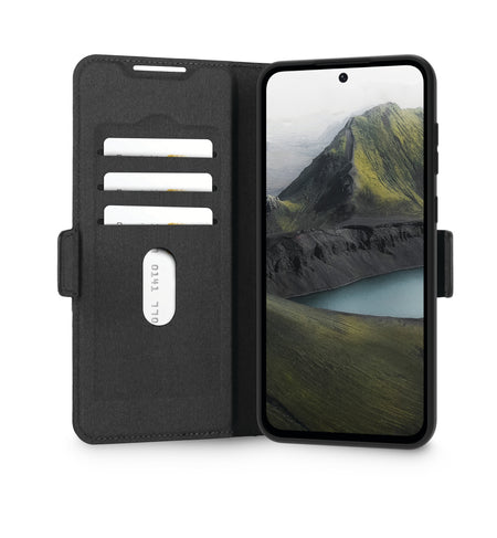 Oslo Pro is an impact protective folio wallet case made from recycled plastic with a finish meant to look and feel like leather. With its foldable back, you can enjoy hands-free horizontal video watching.
