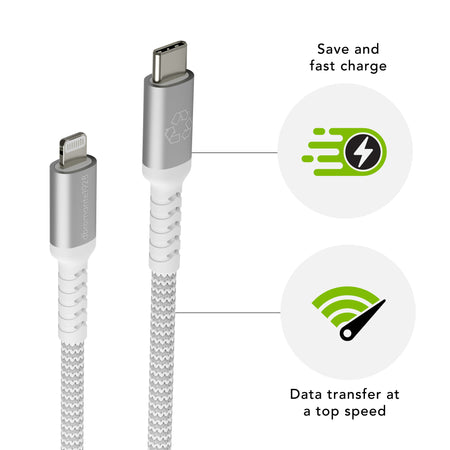 Charge and sync your Apple device with this premium 2m USB-C to Lightning braided cable, offering fast and reliable connection with a woven fabric exterior reinforced with super strong zinc alloys for extra durability and a luxurious look and feel. Unlike most cables, this Eco-designed cable is 100% recyclable and made with 100% recycled fabrics, zinc alloys, and plastics. Compatible with all USB-C chargers, and the design of the cable is case-friendly.