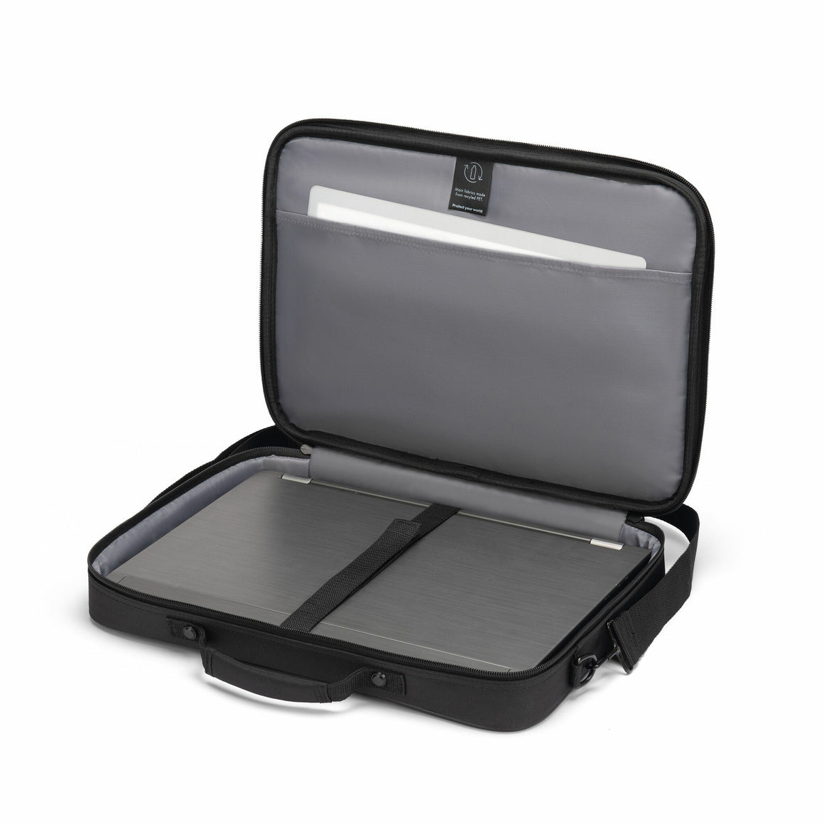 A fastening strap also ensures that your device is held in place securely without slipping. Documents and mobile accessories such as your smartphone, business cards, pens and so on are always within easy reach in the zip pocket on the front. The length-adjustable and removable shoulder strap and handle make the bag very easy to carry. The ONE series emphasises the durability of the product with an extended five year guarantee - and they are all using recycled PET main material!