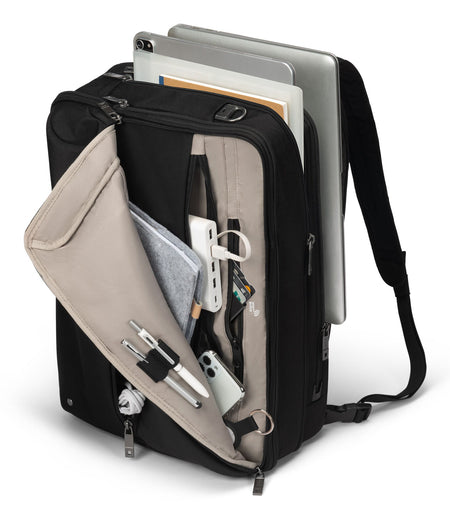 Flexibility meets security with the Top Traveller DUAL FIVE, a convertible business bag that seamlessly transforms from a sleek briefcase into a practical backpack. Equipped with DCT Notebook Protection and a lockable compartment, your laptop stays safe, while the hidden backpack straps allow for effortless switching between carrying styles. The main compartment offers space for tablets, documents, and mobile equipment, while the front section includes structured pockets for accessories and a dedicated small pocket for cables and essentials. Plus, with 35.5 recycled PET bottles used in production, it's a smart, eco-conscious choice.