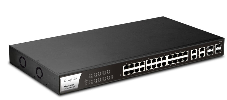 The VigorSwitch P1282 is a high-performance, Smart Managed Gigabit Ethernet switch with 4 SFP uplink ports. With 24 PoE+ (Power over Ethernet) RJ-45 LAN ports, it's ideal for powering connected IP phones, IP cameras and wireless access points.