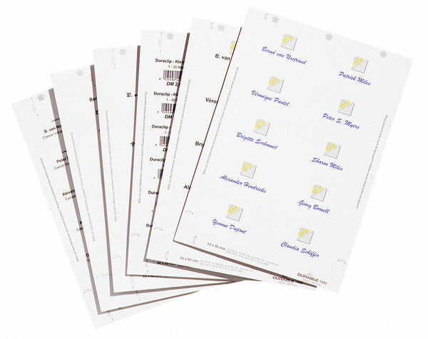 A4 micro-perforated badge insert sheets for use with laser, ink-jet or dot matrix printers and copiers. Easy burst A4 sheets, smooth edges. Size: 54x90 mm