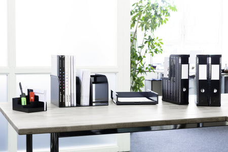 Desk organizer with 5 compartment partitions for pens, scissors, letter clips etc., and an additional compartment for letter envelopes. The product bears the Blue Angel Ecolabel. Dimensions: 162 x 110 x 118 mm (W x H x D) Material: polystyrene, min. 80% post-consumer recycling material