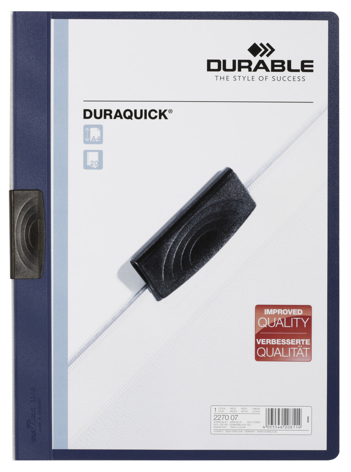 DURAQUICK®, the clip folder with style. Plastic clip folder for 1-20 sheets unpunched A4 paper. Clear soft plastic front cover and coloured rigid plastic back cover. Sturdy long-life clip made of special plastic. Flat, hard wearing, stylish clip.