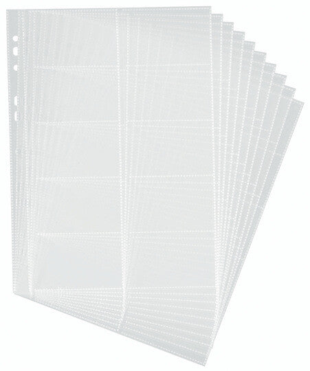 10 transparent polypropylene pockets for 200 business cards (54x90mm), multi-punched for all ring binders and files.