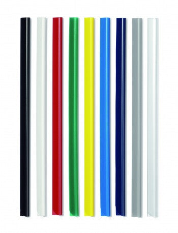 DURABLE's plastic spine bars are a versatile binding system for unpunched papers. Available in 8 colours. The uniquely designed contoured ends provide simple and easy insertion of all papers. Length: 297 mm (A4), Binder Width: 13 mm, Depth cap.: 6 mm