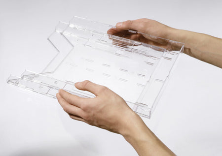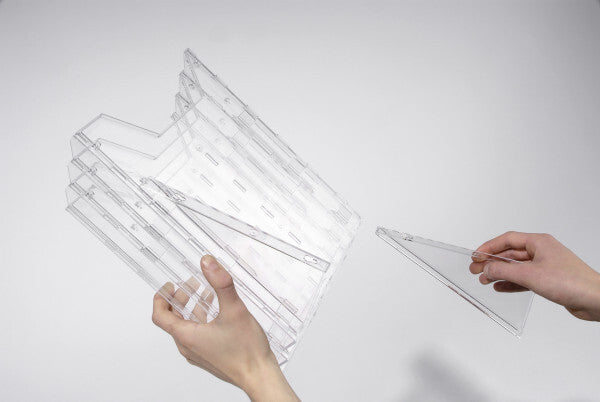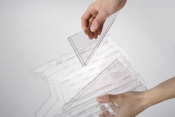 - Consists of 3 trays, 2 carrier elements and a front panel, can be used as wall or table sign