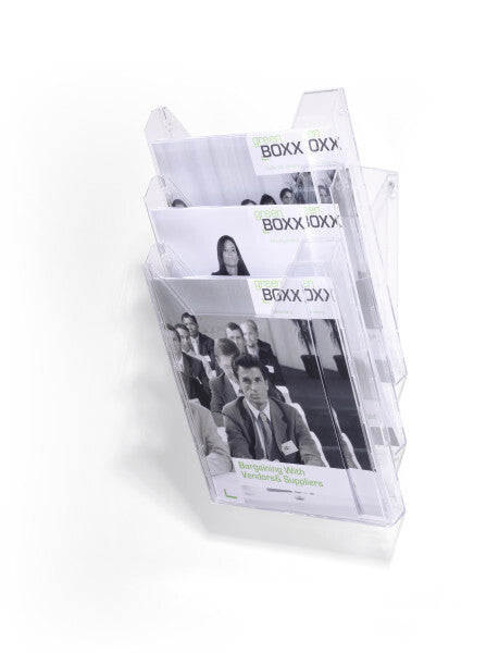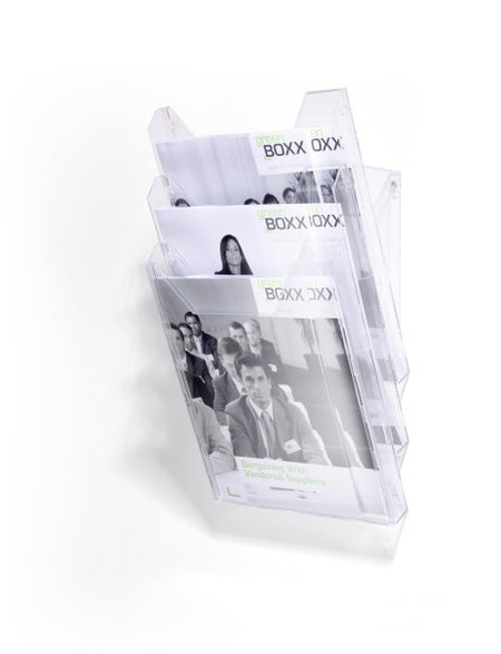 Set of three literature holders for displaying and presenting A4 format information (311x240 mm). Includes three trays, two brackets and one front plate. Extendable with COMBIBOXX A4 EXTENSION (product #8579). Dimensions: Stand 291 x 242 x 217 mm (H x W x D) Wall 445 x 242 x 152 mm (H x W x D)