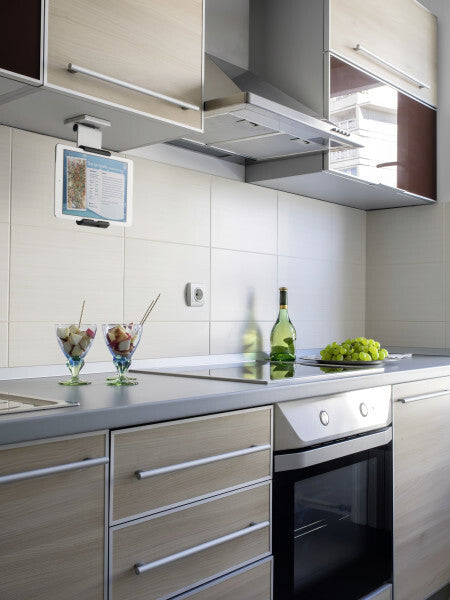The attractive, wall-mounted tablet holder with steplessly variable angle adjustment stands for numerous multi-functional applications such as industrial use in production plants, but also in the private sector, thus providing a high degree of flexibility. The support arm with its variable angle offers numerous options for interactive use including data input to ensure optimal benefit from the tablet when mounted on a wall.