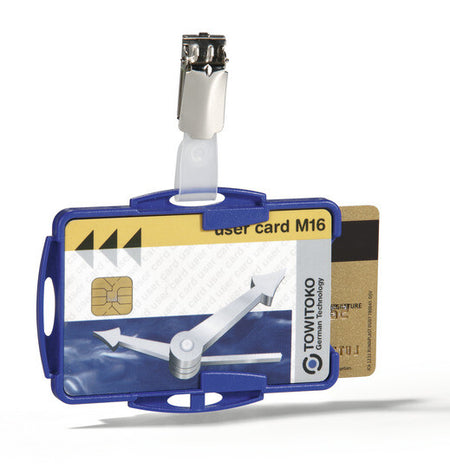 Dual Security Pass Holder with rotating clip fastener. Securely holds two ID cards in portrait or landscape format. Can be combined with chains, textile necklaces and badge reels.