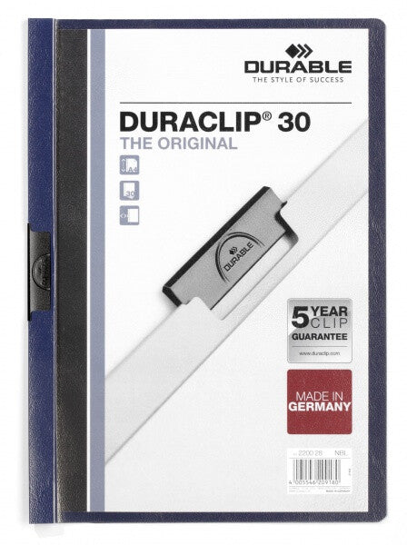 The original DURACLIP file made of PVC plastic with a special sprung steel clip. Ideal for presentations, filing, quotations, conference / seminar notes and reports. The DURACLIP 30 folder has a capacity of 30 A4 sheets, a transparent front coverr and coloured back and spine. A full range of additional accessorie are available. Cover imprints, such as company logos, transform DURACLIP into a unique advertising facility. DURACLIP can also be supplied in special colours. The DURACLIP system: Pull out the clip, insert the documents and push back the clip - simple! The unique sprung steel clip adjusts itself to the number of sheets - time after time.