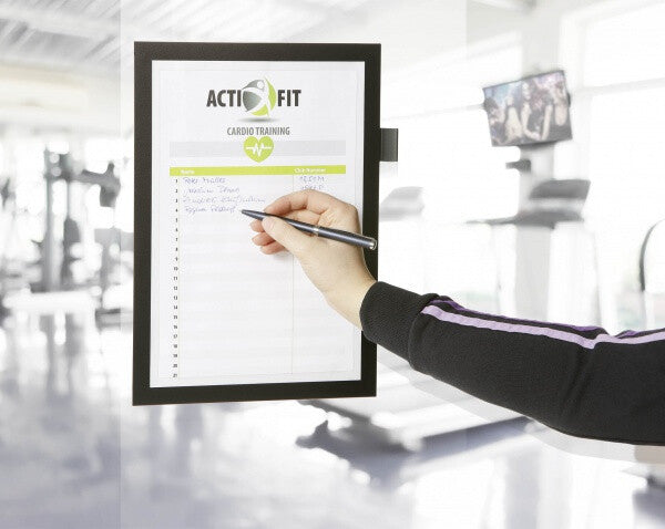 Self adhesive A4 information sign with folding magnetic front panel used to secure up to 5 loose A4 sheets of paper which can be directly written on from within the frame. DURAFRAME NOTE can be applied to any smooth, solid surface and can easily be repositioned and is useful for environments where information or notices may need to be changed frequently such as visitor lists, cleaning schedules or order lists. A handy pen holder is featured on the side of the frame to enable quick update of information. Insert sheets can be easily removed and replaced by simply lifting the front magnetic panel and securing shut.