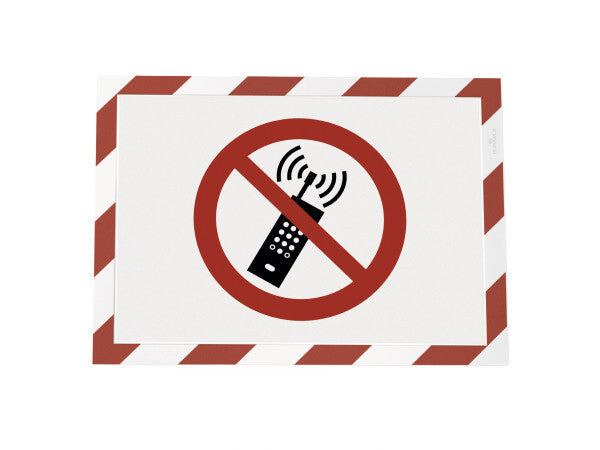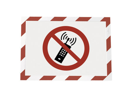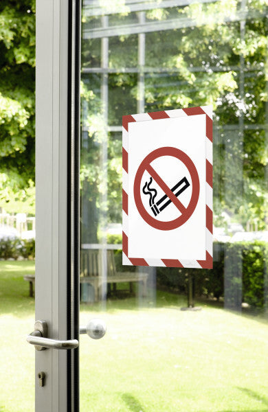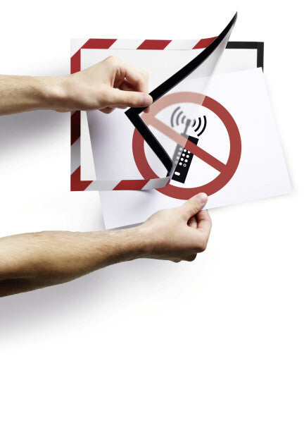 The self-adhesive, twin coloured infoframe DURAFRAME SECURITY is the ideal solution for safety signs in A4 format on solid surfaces.