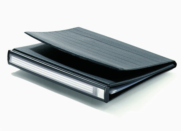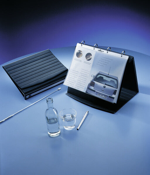A range of high-quality and very attractive presentation table flipcharts. Created for a wide range of uses such as trade fairs and exhibitions as well as training courses, but also for a personalised presentation to a select group. The quality and class of this range is revealed through the soft ribbed metallic grey PVC material, along with a unique removable spine label for the easy identification of all presentations. All DURASTAR presenters canbe stored vertically.For format: A4 Landscape.Size:290 high x 320 wide,38 spine width,290 deep (standing)