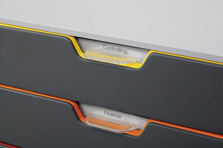 Attractive, innovative drawer box with five colourful drawers made of premium-quality plastics. Each drawer is colour coded to aid document organisation. The drawers open smoothly and soundlessly, with drawer stops. Suitable for holding A4, C4, folio and letter size formats. The box comes with transparent labelling windows and EDP-printable, easy-to-exchange label inserts. Stackable with skid proof plastic feet. Suitable for side-by-side arrangement to fit into all standard office cabinets and sideboards.