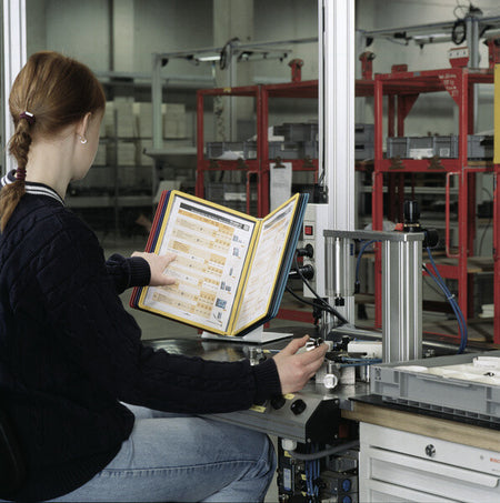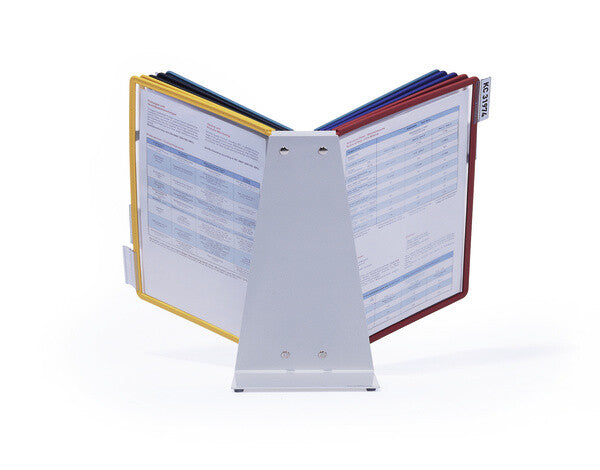 VARIO is a range of robust and economical display panel systems ideal for use in industrial areas including warehouses, kitchens and factory floors. The Desk Unit 10 is a ready to use desk system with a sturdy metal bracket, 10 A4 display panels (ref. 5606) and tabs. The panels are anti-glare and copy-proof. Units are ideal for holding heath and safety instructions, machine operating instructions, and much more.