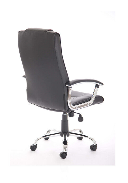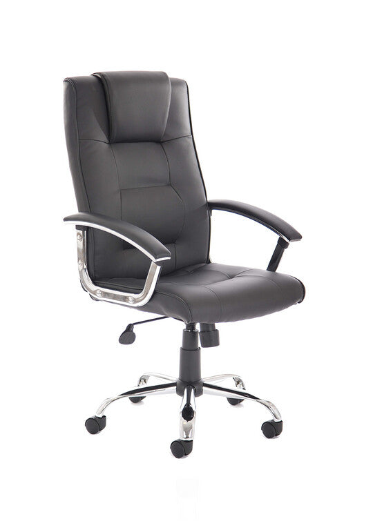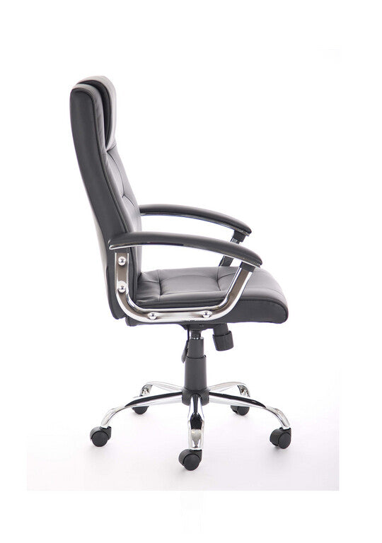 A budget leather exec chair packed with design highlights and comfort factors. The Thrift features lumbar pad, chrome and leather materials and generous proportions