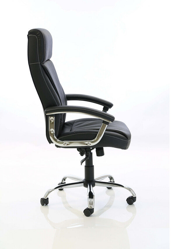 A luxurious bonded leather and chrome executive chair with comfort pads, tilting action and stylish stitching detail. Integral padded headrest.
