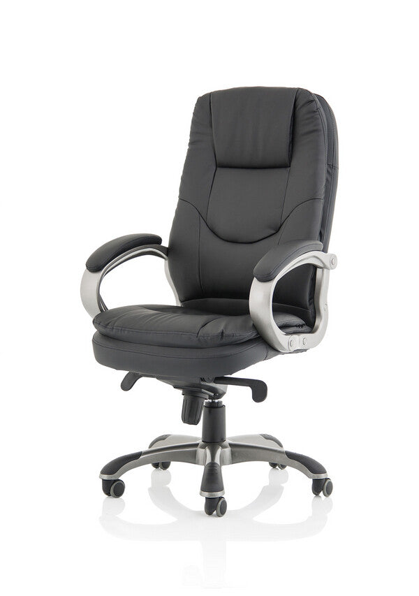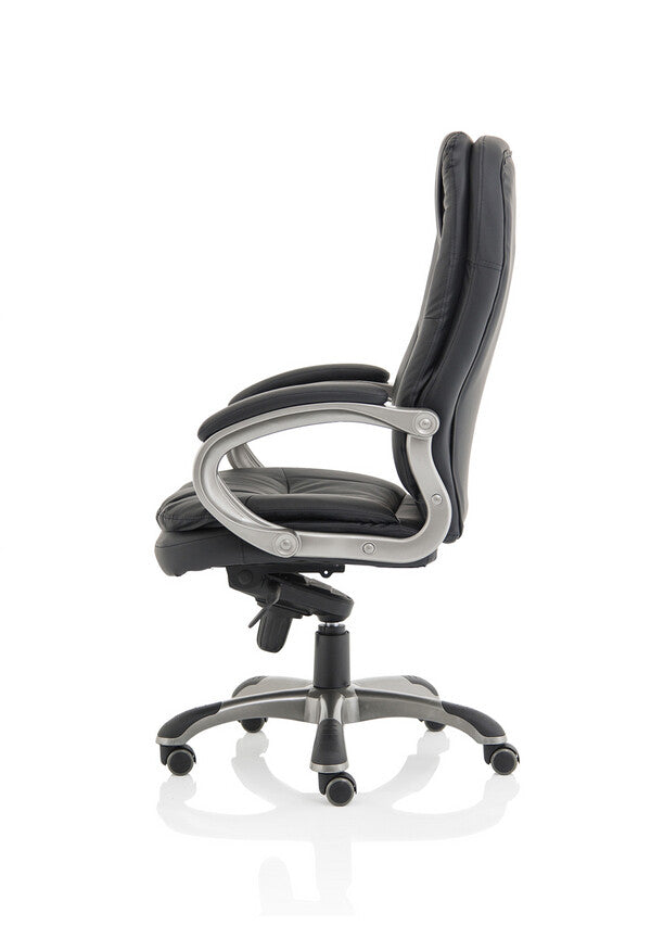 The Oscar executive chair swathes the user in a generously upholstered seating solution that incorporates a luxuriously deep seat and back and big armrests all wrapped in a soft touch faux leather. The stunning gun metal armature and base contrast with dramatic black upholstery. Multiple panels ensure the user is supported in exactly the right place no matter what the demands in the working day