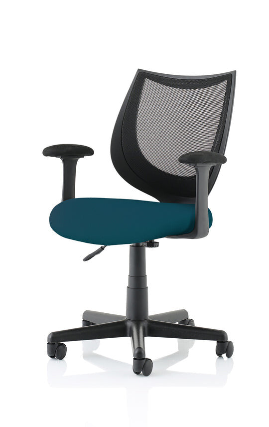 The medium back chair has black mesh upholstery with a metal frame. This operator chair comes with fixed arms. Castors allow easy mobility within an office environment.