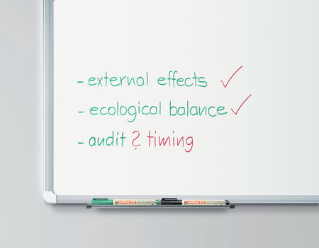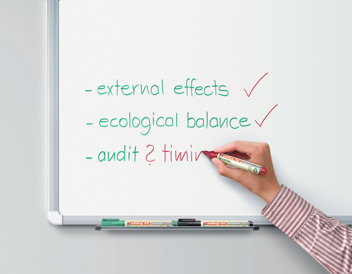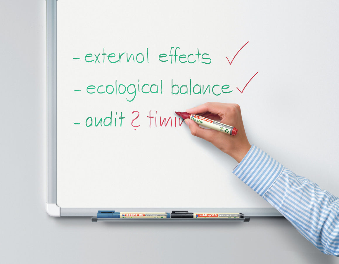 Whether in the office, at presentations or at lectures, giving back to the world feels always great. It is especially easy with the edding 28 EcoLine whiteboard marker, as at least 90% of the total plastic used comes from recycled material. Thereof even 83% from post-consumer plastics such as used yoghurt pots or watering cans. The edding 28 EcoLine whiteboard marker has a round nib releasing an ink, which can easily dry-wiped from virtually all non-porous surfaces.