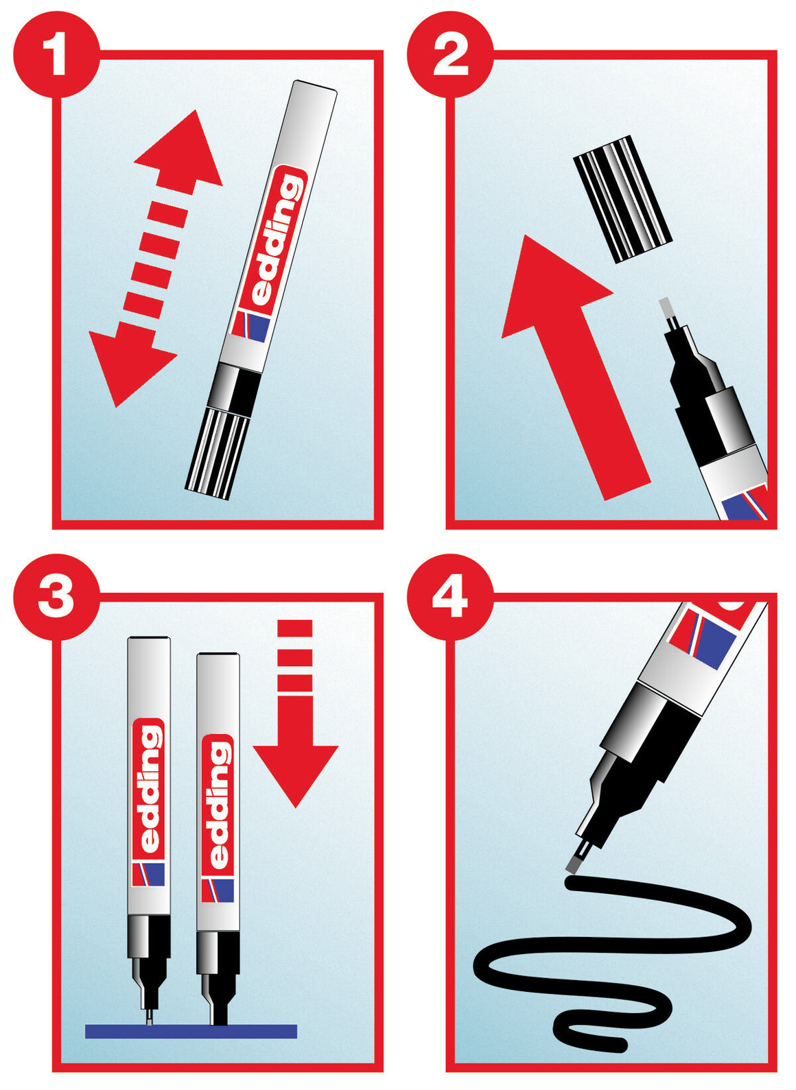 The edding 750 gloss paint marker has a 2 - 4 mm thick bullet nib and is available in 14 colours. To use, shake the pen briefly with the cap on, then open the pen and place the nib on a piece of scrap paper. Carefully pump it up and down until ink fills the nib. The gloss paint marker is now ready to use. The ink is very low odour and once dry is resistant to water, abrasion, light and heat.