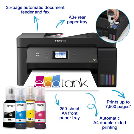 The compact ET-15000 EcoTank offers A4 print, scan, copy and fax, plus the option to print A3+ from the rear media feed. Additionally, its LCD screen make it easy to print without a PC.
