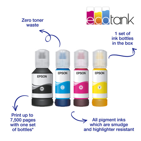 Save every time you print with this EcoTank that delivers an incredibly low cost per page. Unlike other printers, EcoTank features large ink tanks that you fill with low-cost ink bottles.