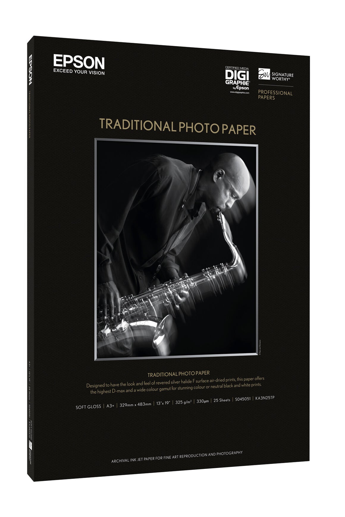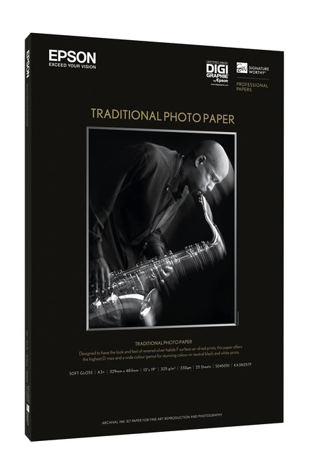 Epson Traditional Photo Paper is a breakthrough paper, designed exclusively for use with Epson's UltraChrome K3 ink, developed in collaboration with many of the industry's leading professional photographers to ensure it meets their most discerning requirements.Many who have contributed to the development of Traditional Photo Paper have commented that it reminds them of revered silver halide papers as well as providing greater creative control due to extraordinary D-Max and tonal transition in black and white. You can also print extraordinary colour with the same paper -something that was not possible with traditional fibre based papers.Combining the artistry of traditional photography with the ease and control of digital output, this unique media offers the same deep blacks, subtle tonal gradations and long-lasting results as the darkroom papers from previous generations. Its fibre base has a rich surface, a continuous tone and soft gloss that are ideal for creating stunning colour or neutral black and white prints that retain the look and feel of traditional fiber paper.Like all Epson innovative media, this paper is engineered to give you the highest resolution and colour saturation possible. As always, Epson supplies guarantees Epson quality.