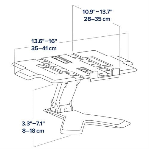 This premium laptop stand features a six-inch (15 cm) height adjustment range, offering true ergonomic functionality: lift, turn and tilt a laptop’s screen to the optimum position to increase comfort.