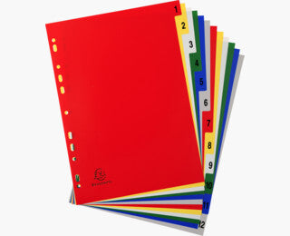 The Exacompta indices are made from 1.2mm polypropylene. The indices are A4 in size and are pre printed 1 to 12 on 12 parts.The indices are pre punched so they can be inserted into a file or folder.The indices come with a printable index page for easy identificationNumbered 1 to 12 Tabs