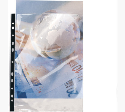 Smooth high transparent pouch with superior quality. Highly resistant material for intensive use.Open top.European punched holes for ringbinders and Lever Arch Files.