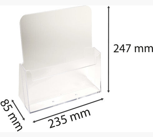 Brochure holders made from clear polystyrene. 1 pocket suitable for A4 leaflets. Max. storage depth 28 mm. Completely assembled (cast in one piece).