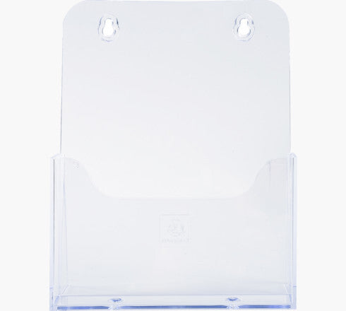 Brochure holders made from clear polystyrene. 1 pocket suitable for A5 leaflets. Max. storage depth 28 mm. Completely assembled (cast in one piece).