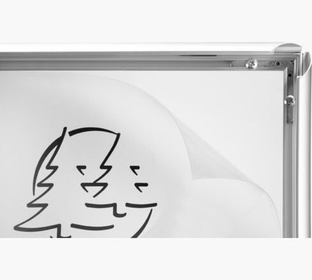 The frame is opened from the front by lifting its wide beveled aluminum edges for easy poster changing.